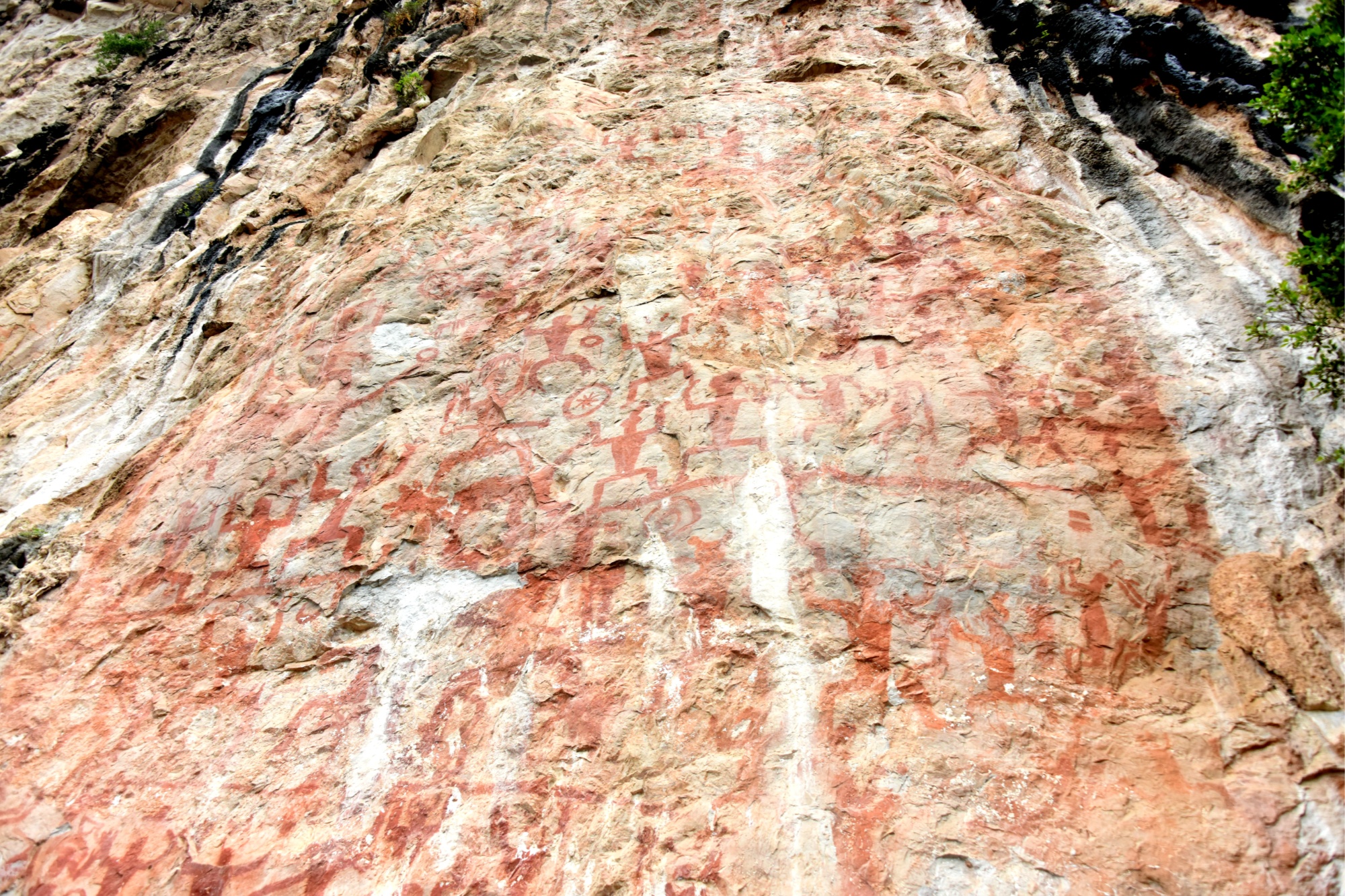 花山,坐落于崇左市寧明縣城西北約25公里的明江河畔,以其古老神奇的巖畫而聞名海內外?;ㄉ綆r畫距今已有2000多年的歷史,刻著人、獸、銅鼓、刀劍、羊角鈕鐘等造型各異的赭紅色圖像,記錄著壯族先民古駱越人的生活、生產(chǎn)和宗教信仰,為中國首個巖畫類世界文化遺產(chǎn)。
