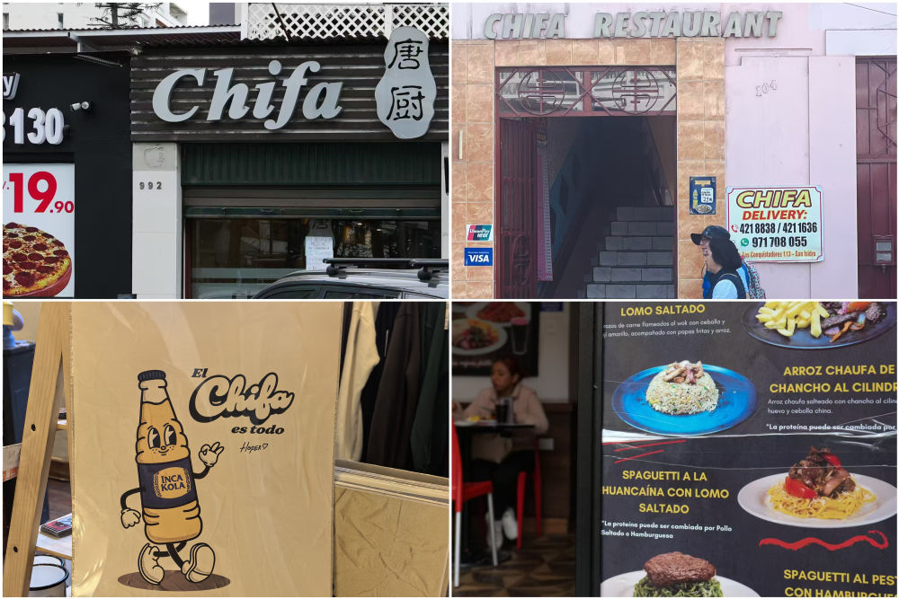 綿延不斷的人文交流,讓秘魯?shù)娘嬍硯狭嗣黠@的中餐印記:中餐館在秘魯被稱作“Chifa”(吃飯)(左上、右上)。炒飯(Chaufa)作為常規(guī)食物,登上了大多數(shù)當?shù)夭宛^的菜單(右下)。Chifa一詞,還被利馬的年輕畫家化用為文化符號,與本土飲料“印加可樂”一起融入到藝術(shù)創(chuàng)作中(左下)。