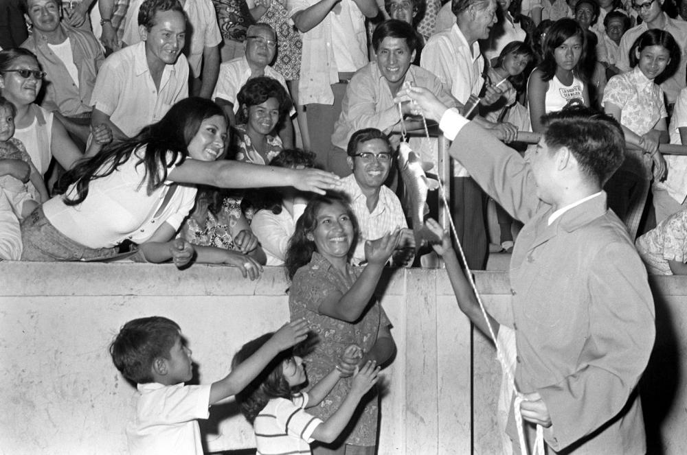 1973年2月,沈陽雜技團赴秘魯進行友好訪問演出。這是演員劉忠表演魔術(shù)《釣魚》,受到秘魯觀眾的熱烈歡迎。