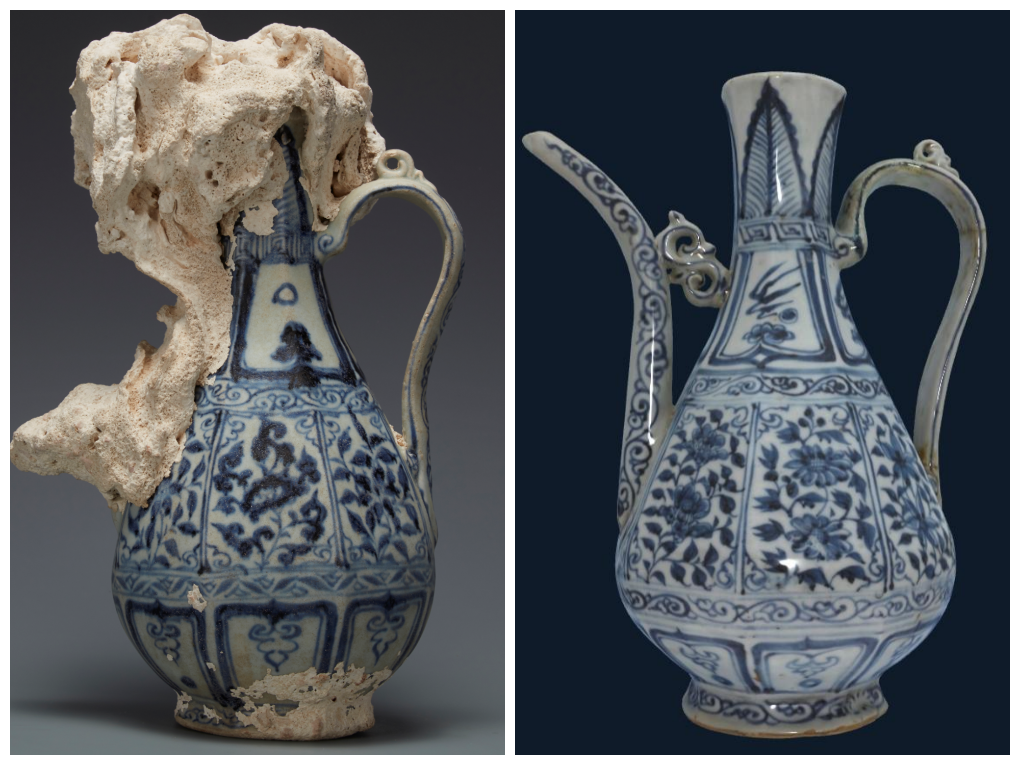 △中國(海南)南海博物館藏元青花花卉紋八棱執(zhí)壺(左)與河北博物院藏青花八棱執(zhí)壺對(duì)比。