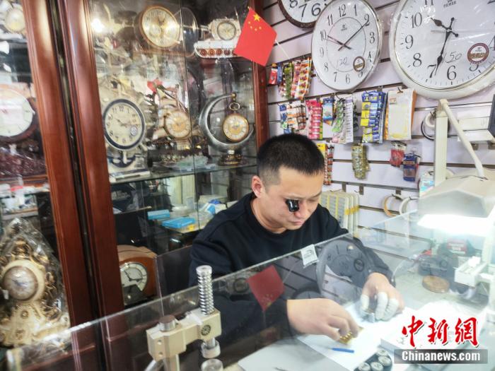 不遠(yuǎn)處,聚亨鐘表店的王晴川正低頭專注修表。這家修表店已經(jīng)傳承了三代人,五年出徒,十年大成,他在此開店已二十三年。秒針的滴答作響中,時間被賦予了新的意義和價值。