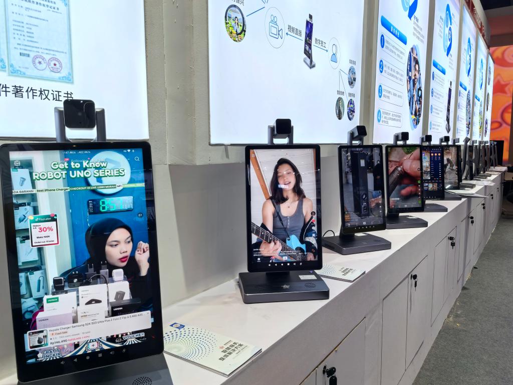 在廣東智慧音視頻科技有限公司的展位前,一排多功能直播智慧機(jī)引起了觀眾的濃厚興趣。該公司跨境電商負(fù)責(zé)人告訴記者,越來越多的中小企業(yè)嘗試“直播+電商”的出海模式,這款產(chǎn)品內(nèi)嵌了短視頻直播的云導(dǎo)播臺(tái),同時(shí)借助外貿(mào)專線,方便企業(yè)高效切入海外興趣電商的“賽道”。