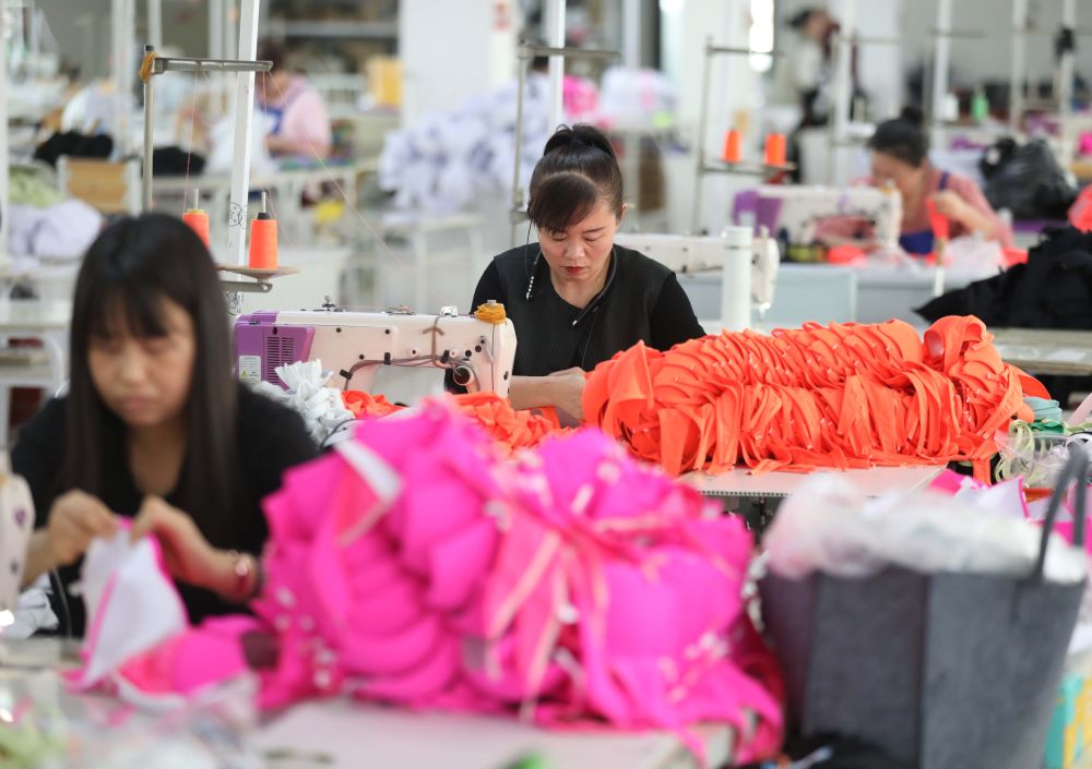 圖為4月18日,興城一家泳裝企業(yè)生產(chǎn)車(chē)間,工人在生產(chǎn)泳裝。新華社記者 楊青 攝