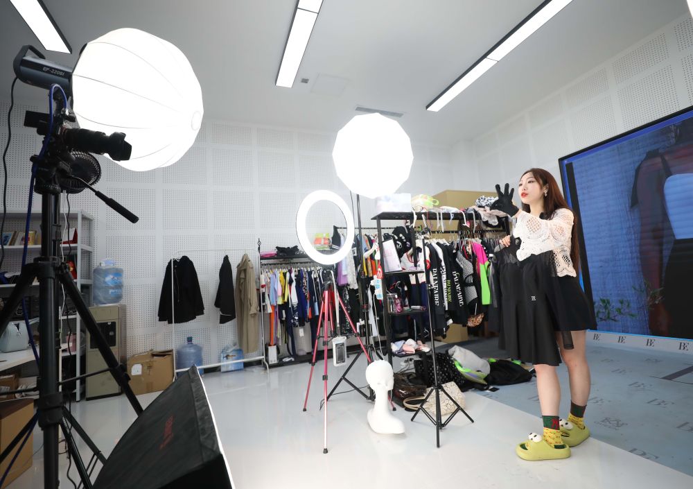 圖為4月18日,葫蘆島一家泳裝企業(yè)在直播售賣(mài)泳裝。新華社記者 楊青 攝