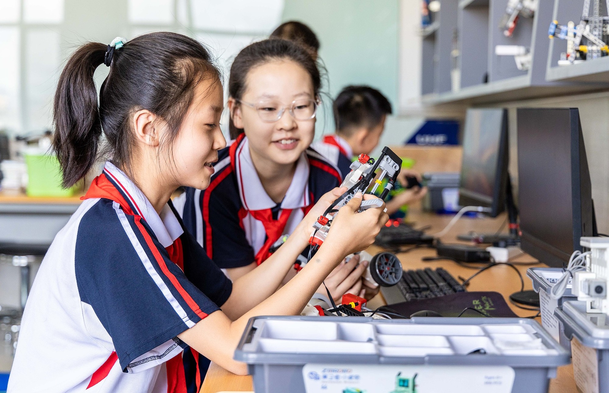 學(xué)生在人工智能科普課堂上組裝機器人