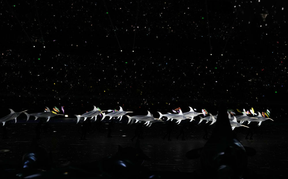 在全場(chǎng)觀眾“哇”的一聲驚嘆中,整座體育場(chǎng)化身星辰大海。騎自行車、滑輪滑、腳踩平衡車的演員們手舉海龜、鯊魚、海豚等形象魚貫而入,讓觀眾如置海底。隨后,高鐵飛馳、深海探測(cè)、火箭發(fā)射、太空行走等畫面在星海中逐一呈現(xiàn),展現(xiàn)了我國在高科技領(lǐng)域的發(fā)展成就,帶來生動(dòng)的沉浸式體驗(yàn)。