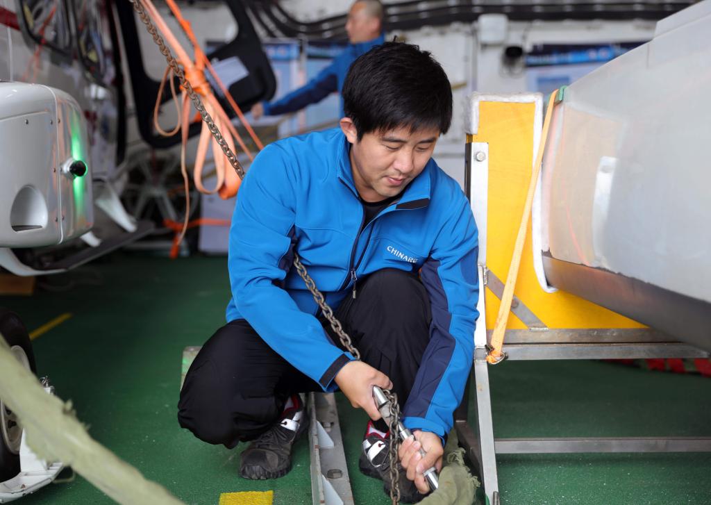 執(zhí)行中國(guó)第41次南極考察任務(wù)的“雪龍”號(hào)和“雪龍2”號(hào)于北京時(shí)間2024年11月19日開始穿越“咆哮”西風(fēng)帶。這是“雪龍2”號(hào)直升機(jī)機(jī)組成員畢凌峰在擰緊直升機(jī)固定件。新華社記者黃韜銘攝