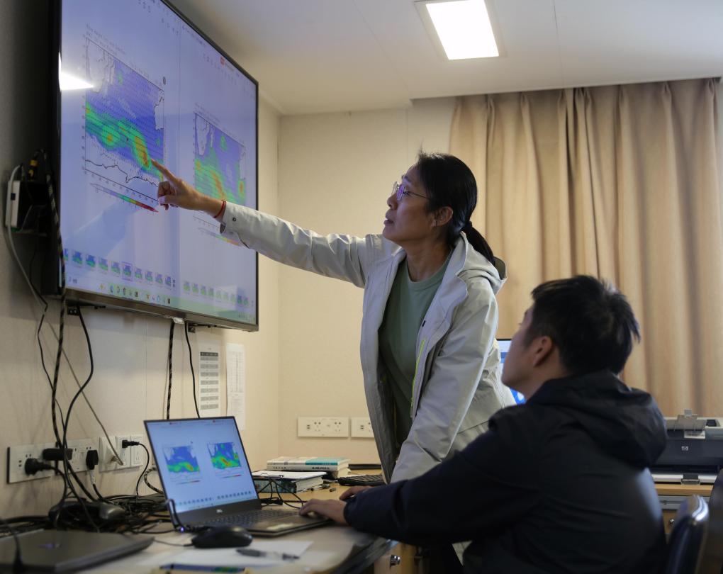 執(zhí)行中國(guó)第41次南極考察任務(wù)的“雪龍”號(hào)和“雪龍2”號(hào)于北京時(shí)間2024年11月19日開始穿越“咆哮”西風(fēng)帶。這是“雪龍2”號(hào)隨船氣象保障員劉素芳(左)在研判天氣情況,規(guī)劃航行路線。新華社記者黃韜銘攝