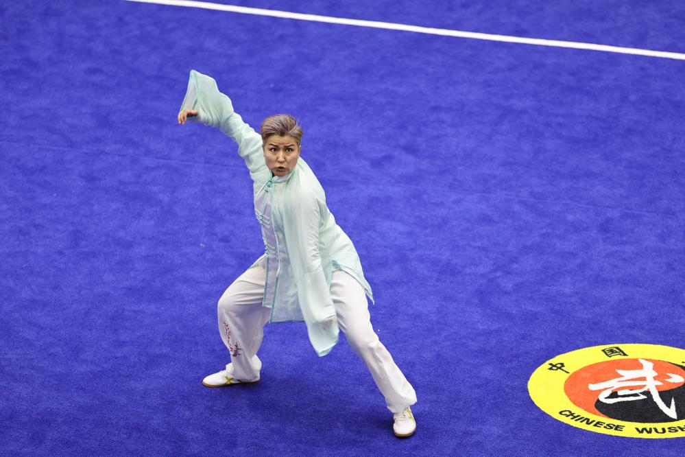 一襲素色的武術(shù)服,衣袖微微飄揚(yáng),維吾爾族女選手地里娜爾·地里夏提的步伐穩(wěn)健扎實(shí),拳法充滿力量與自信。