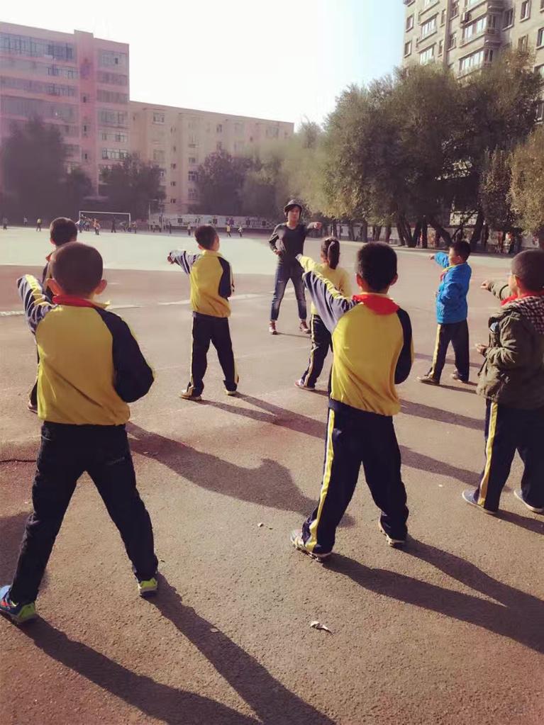 地里娜爾在烏魯木齊市的一所小學(xué)帶領(lǐng)孩子們練習(xí)拳法。 受訪者供圖