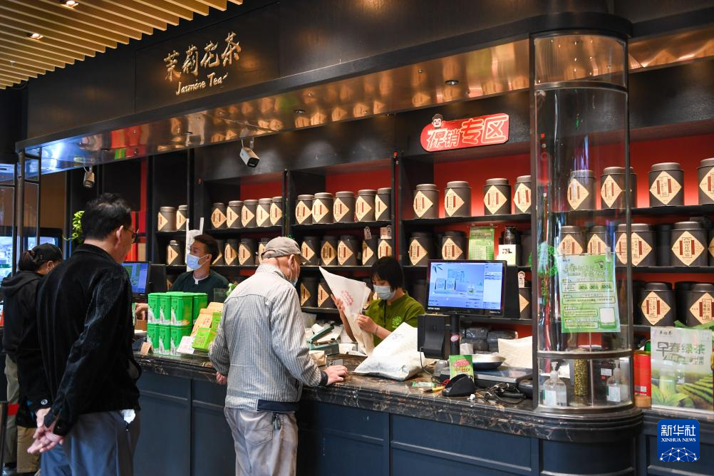 在吳裕泰北新橋總店,顧客在選購茉莉花茶(4月16日攝)。新華社記者 鞠煥宗 攝