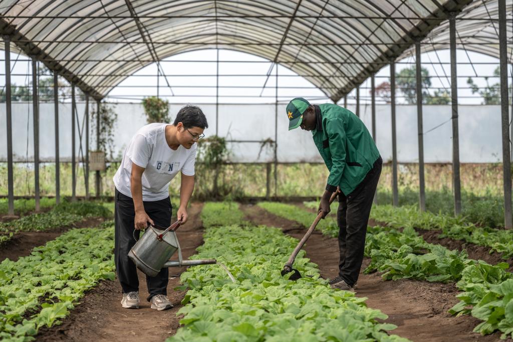 2024年8月3日,在剛果(布)首都布拉柴維爾的中國援剛果(布)農業(yè)技術示范中心內,中方農業(yè)專家李科明(左)與當?shù)貑T工在大棚內耕作。(新華社記者鄭揚子攝)