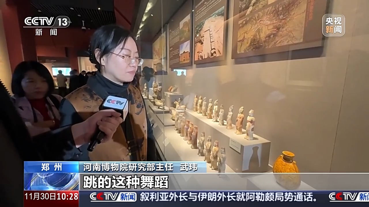 河南博物院研究部主任 武瑋:樂舞者的形象高鼻深目,戴有一種翻帽,穿的是那種圓領(lǐng)或者是翻領(lǐng)的長袍。當(dāng)時的人稱為胡人的形象,跳的這種舞蹈,包括使用的樂器,可能最主要是來自中亞。