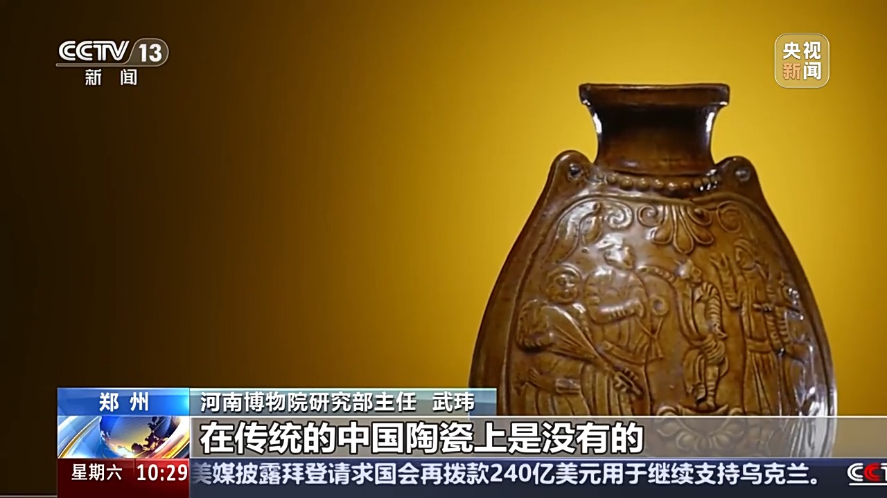 河南博物院研究部主任 武瑋:這種題材實(shí)際上在傳統(tǒng)的中國陶瓷上是沒有的。北朝的時期整個社會對它的一種崇尚或者一種喜好,才會出現(xiàn)這樣一個題材,整個中西方的交流在深入發(fā)展。
