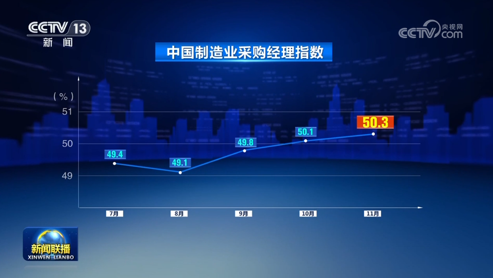 11月份中國制造業(yè)采購經理指數為50.3%,比上月上升0.2個百分點。