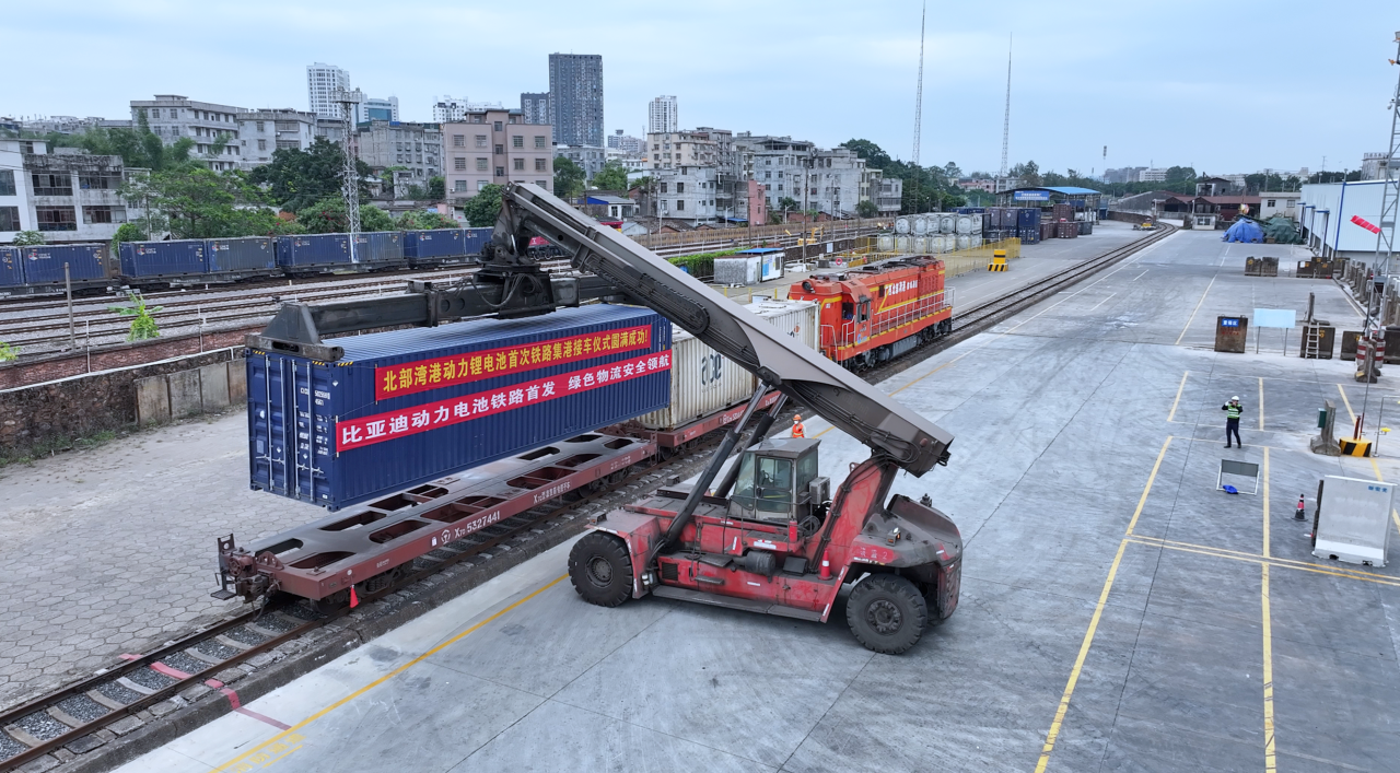 11月19日,一列載著比亞迪新能源動力鋰電池的列車,從重慶長壽區(qū)渝巴專用鐵路發(fā)車,沿著西部陸海新通道南下,于22日駛?cè)霃V西北部灣防城港新宏光鐵路專用線。隨著接卡作業(yè)的完成,全國首次鐵路發(fā)運(yùn)動力鋰電池在北部灣港順利接卸。