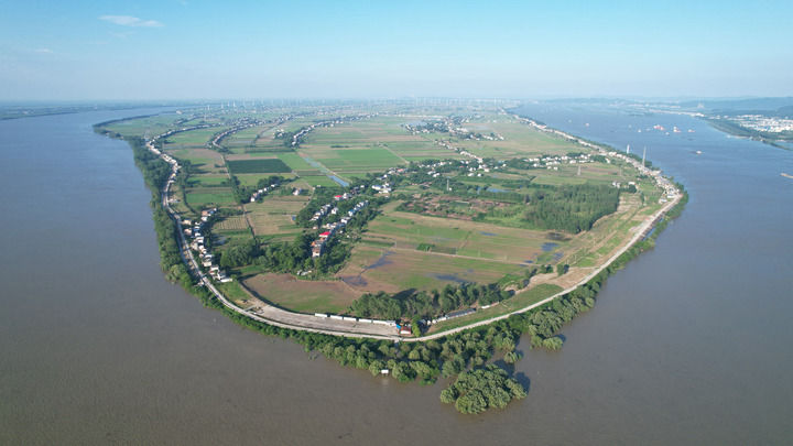 從江西省九江市江新洲洲頭鳥瞰江新洲(2024年7月4日攝,無人機照片)。