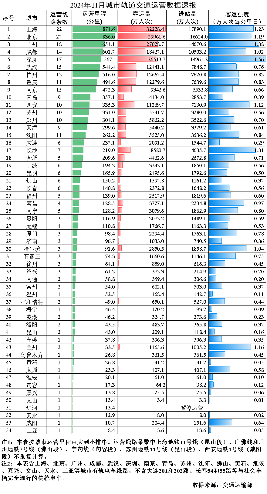 交通運輸部發(fā)布消息,2024年11月,31個?。ㄗ灾螀^(qū)、直轄市)和新疆生產(chǎn)建設兵團共有54個城市開通運營城市軌道交通線路313條,運營里程10522.1公里,實際開行列車340萬列次,完成客運量27.1億人次,進站量16.2億人次。11月份,客運量環(huán)比減少0.6億人次,降低2.2%,同比增加1.3億人次,增長5.2%。11月份全國總運營里程的平均客運強度為0.860萬人次每公里日,環(huán)比增長0.8%,同比增長1.9%。