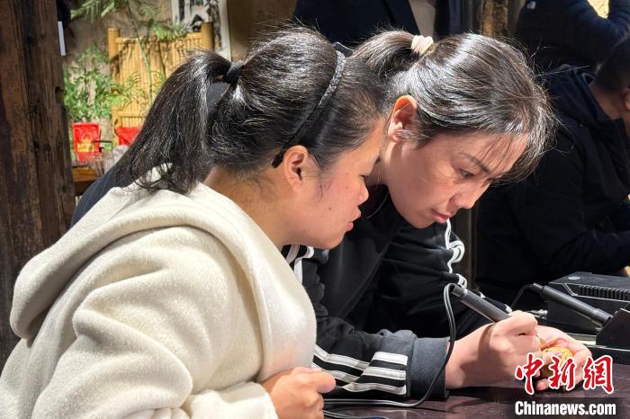 王小榮(右)在教游客葫蘆烙畫。錢晨菲 攝