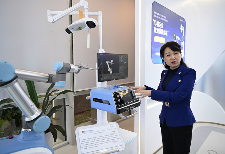澳門企業(yè)真健康(廣東橫琴)醫(yī)療科技有限公司創(chuàng)始人張昊任在介紹“導航定位微波消融系統(tǒng)”(2024年11月24日攝)。新華社記者 鄧華 攝