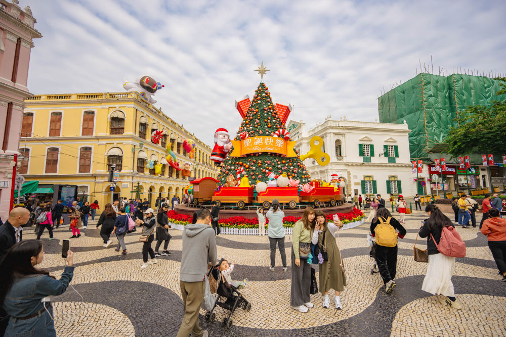 12月12日,游客在澳門議事亭前地的圣誕樹前拍照。新華社記者 朱煒 攝