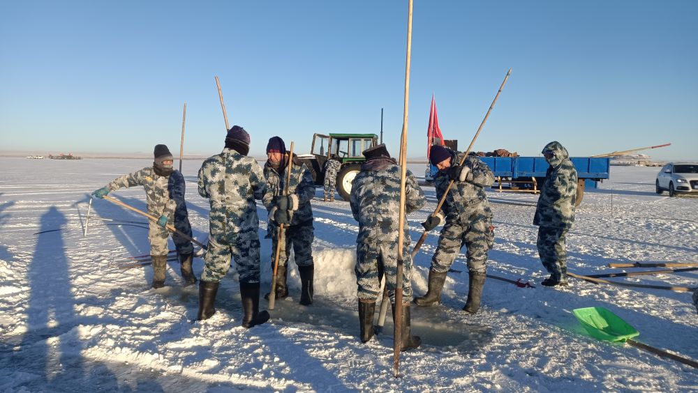 遼闊的達(dá)里湖銀裝素裹,在零下二十?dāng)z氏度左右的嚴(yán)寒中,漁業(yè)工人們開始了一系列精細(xì)而有序的冬捕作業(yè)準(zhǔn)備工作。
