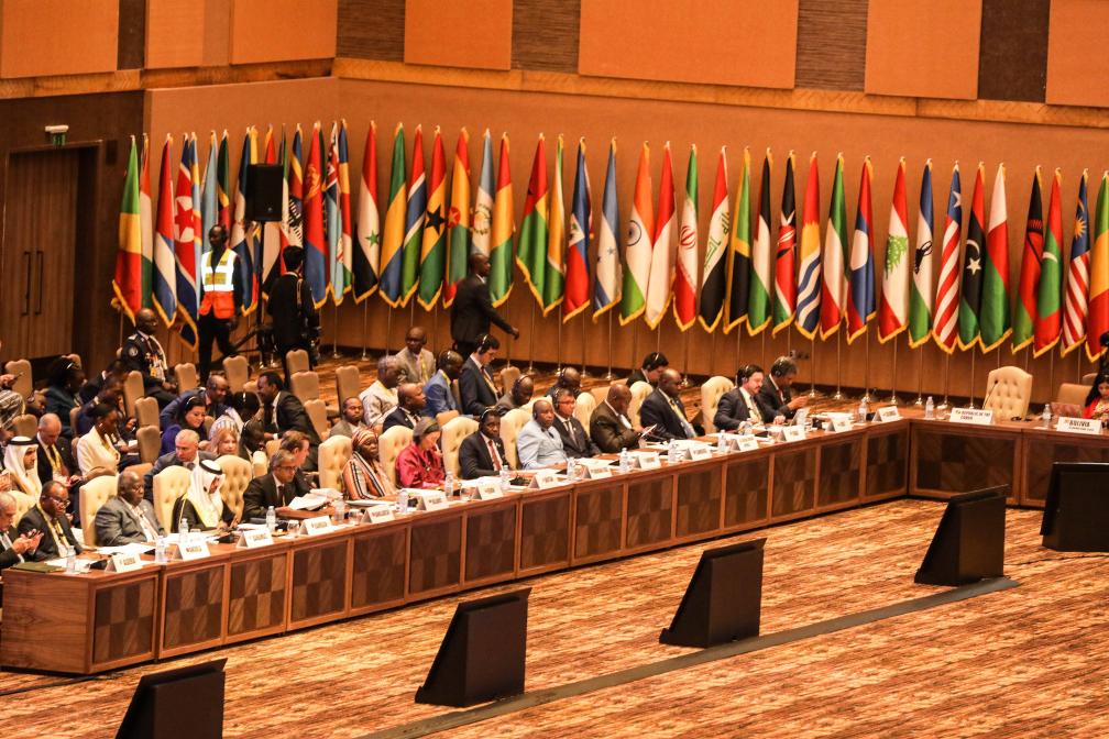 這是2024年1月19日在烏干達(dá)首都坎帕拉拍攝的不結(jié)盟運(yùn)動(dòng)第19次峰會(huì)會(huì)場(chǎng)。新華社發(fā)(阿佳拉·納瓦達(dá)攝)