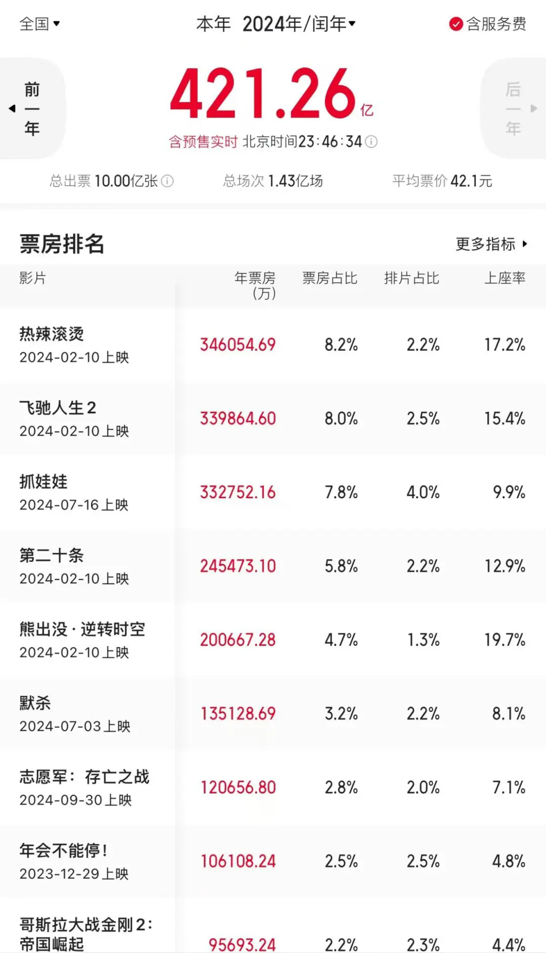 總票房421.26億元