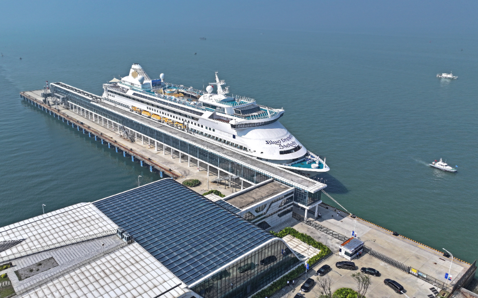 圖為2024年11月15日在北部灣國(guó)際郵輪母港拍攝的即將執(zhí)行首航任務(wù)的“藍(lán)夢(mèng)之歌”號(hào)郵輪。新華社發(fā)(無人機(jī)照片,周華攝)。