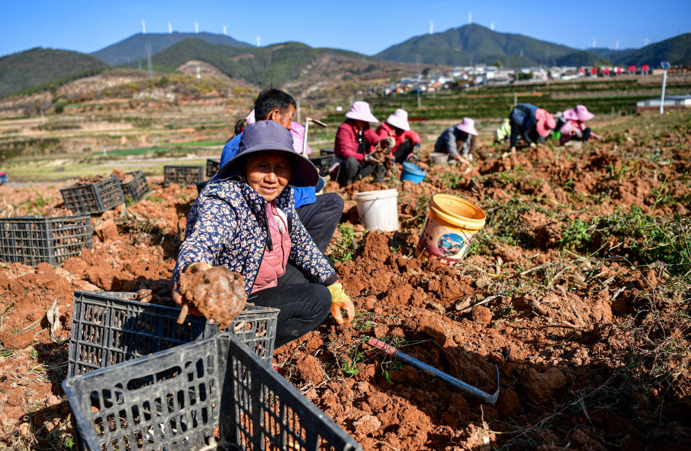 在四川攀枝花市仁和區(qū)板栗現(xiàn)代林業(yè)園區(qū),農戶在采收魔芋(2024年12月10日攝)。