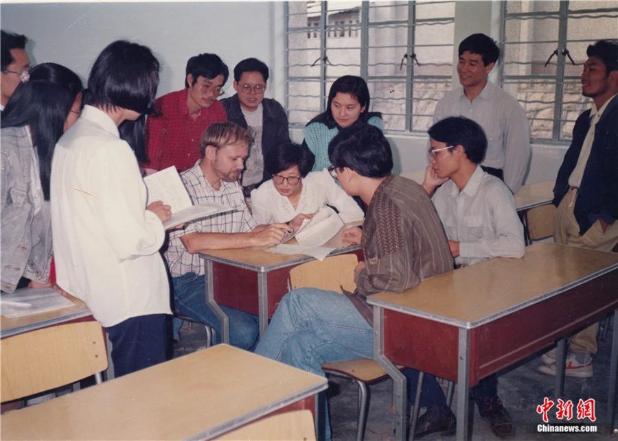 20世紀(jì)80年代末,潘維廉在廈門大學(xué)的課堂上與學(xué)生交流。受訪者供圖