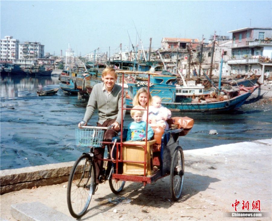 1988年,潘維廉騎著三輪車帶著家人走遍廈門的大街小巷。受訪者供圖