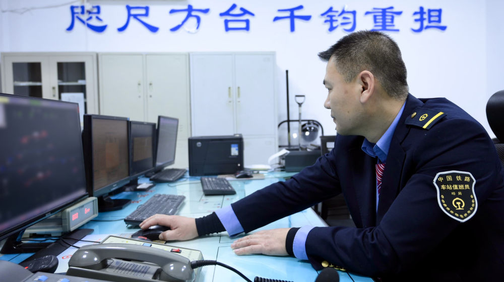 1月12日,佳木斯車務(wù)段撫遠(yuǎn)站值班員田春在操作臺(tái)組織調(diào)度。新華社記者 徐凱鑫 攝