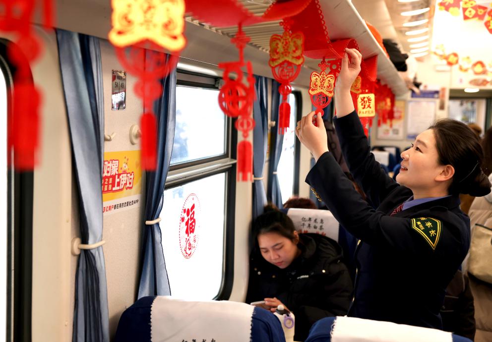 1月14日,列車工作人員在裝飾車廂。新華社發(fā)(王旺旺攝)