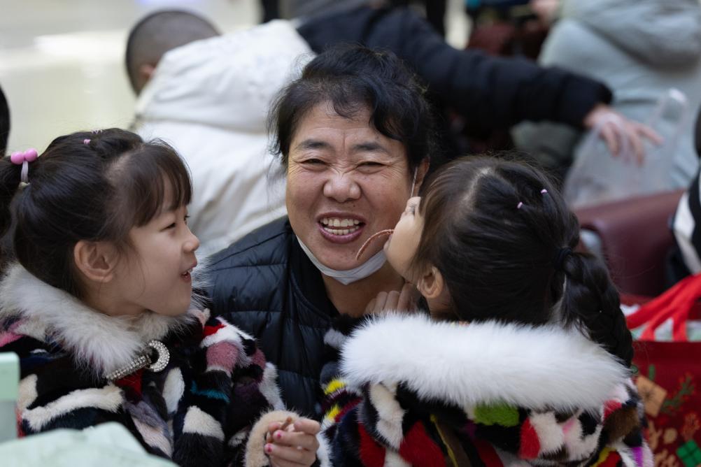 1月14日,在哈爾濱火車(chē)站候車(chē)大廳,小朋友和姥姥一起吃東西。她們從黑龍江省牡丹江市去往海南省??谑羞^(guò)年。新華社記者 張濤 攝