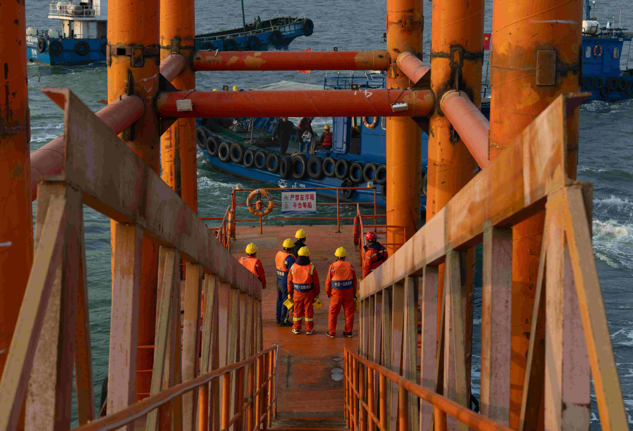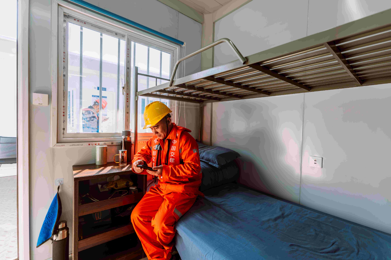 梁芝敬和工友們工作的位置在離岸2海里的海上。一座總面積5萬(wàn)多平方米的海上平臺(tái),構(gòu)成了建設(shè)者們生活和工作的海上空間。工人們加班建設(shè)的劉五店航道橋,是廈金大橋(廈門(mén)段)關(guān)鍵控制性工程,全長(zhǎng)1948米,是福建省內(nèi)最大跨徑橋梁,也是福建省首座全離岸式海中懸索橋。春節(jié)前,項(xiàng)目部要完成沉井系梁6000方以及主塔套箱6640方封底混凝土澆筑任務(wù)。為此,梁芝敬和工友們需要不間斷倒班作業(yè),以保障工程任務(wù)能夠如期完成。而記者采訪時(shí),距離梁芝敬上一次離開(kāi)海上平臺(tái),已經(jīng)過(guò)去57天。
