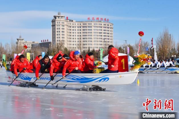 1月20日,內(nèi)蒙古盛世柳蘭代表隊(duì)代表中國(guó)參加錫林郭勒國(guó)際冰上龍舟錦標(biāo)賽。孫沐野攝