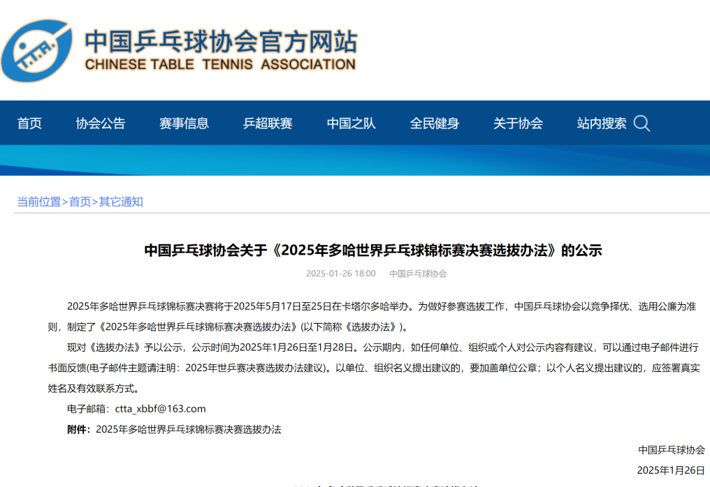 中國乒協(xié)26日在官網(wǎng)公示了《2025年多哈世界乒乓球錦標(biāo)賽決賽選拔辦法》(以下簡稱《選拔辦法》)。