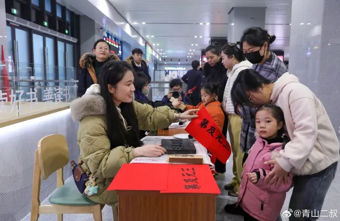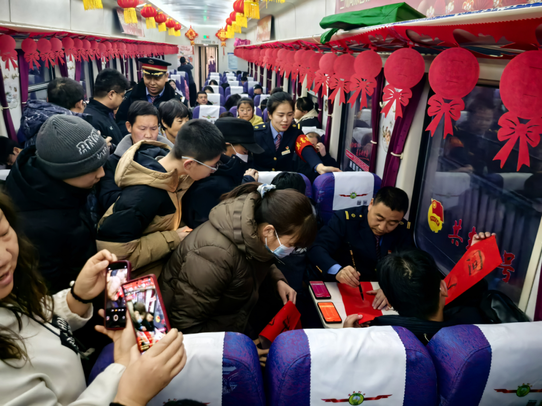 在從隴西開往青林的7504/7503次列車上開展的“新春送?!被顒?,現(xiàn)場書寫福字與春聯(lián),把誠摯美好的新春祝福融入其中。