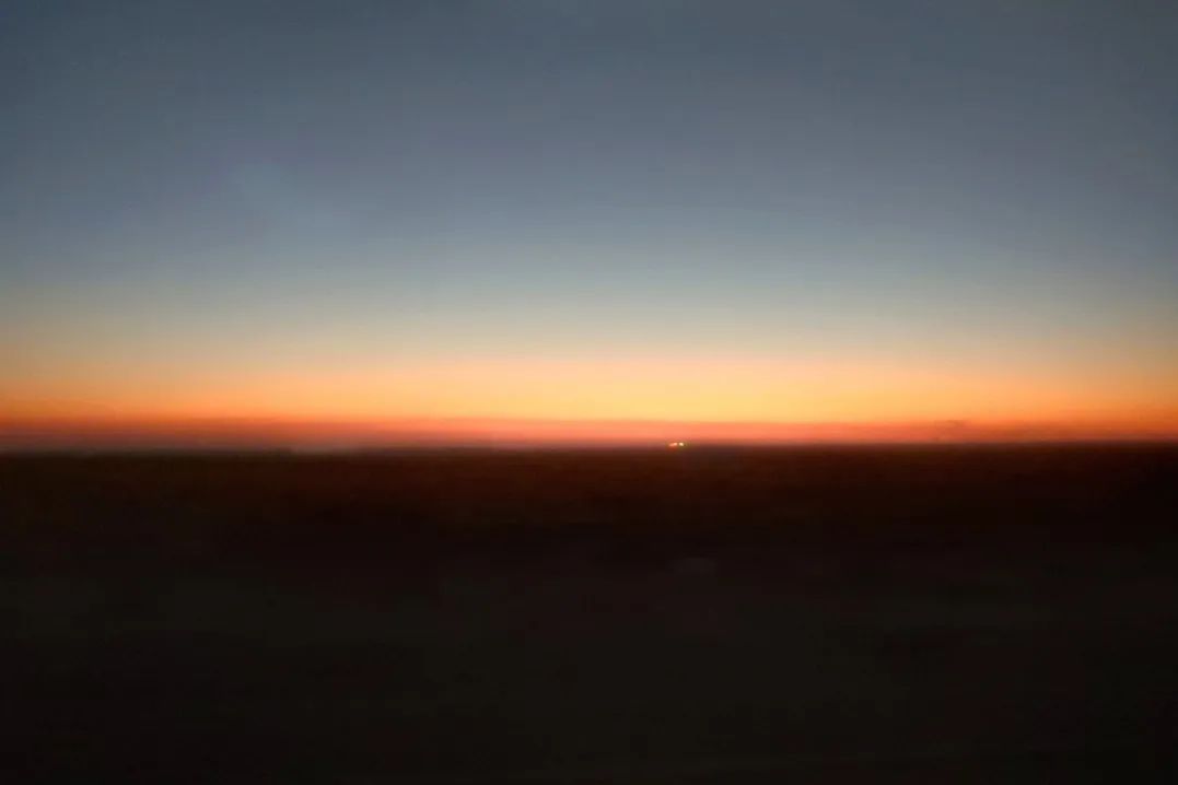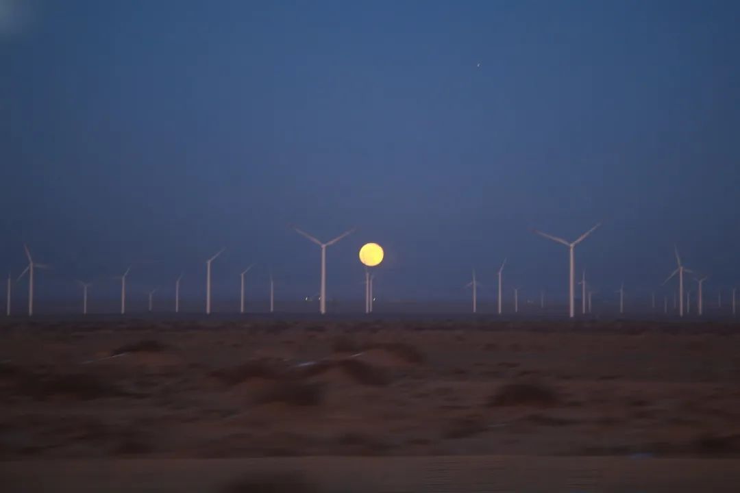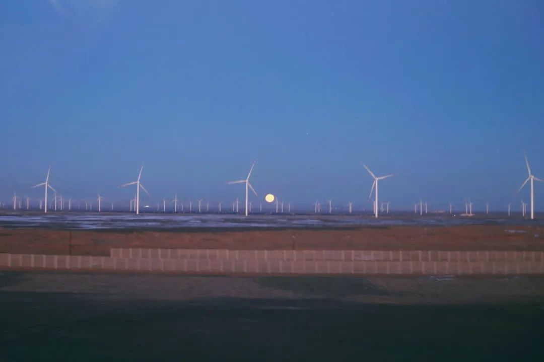 在前往家鄉(xiāng)的列車上經過哈密時,我坐在窗邊正吃著泡面,抬頭便看到這絕美月色,我用相機將它定格,而在車廂的另一邊是落日,兩種景色交匯在此,也應了窗貼上這句“回家的路,就是最美的風景”。