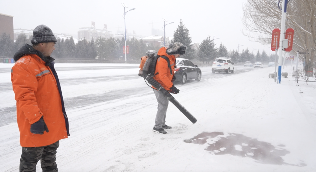 雪越下越厚,風(fēng)機(jī)已難以應(yīng)對(duì)。王師傅遞來(lái)一把鐵鏟說(shuō):“要注意,不要直來(lái)直去地鏟,而是要斜著發(fā)力,這樣一次能鏟更多雪,也不容易刮壞地面的紋路。”