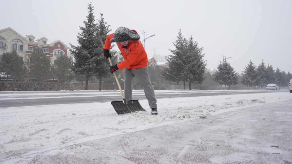 圖為新華社記者恩浩在科右前旗罕山街鏟雪。新華社發(fā)(路斌攝)