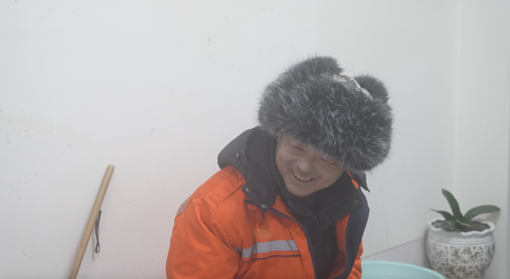 從下午1點(diǎn)半到4點(diǎn),記者和工友們一刻未停。風(fēng)雪中,大伙都變成了“白眉大俠”,睫毛上也結(jié)了冰。王師傅提出,去附近的環(huán)衛(wèi)驛站里歇歇腳,喝些熱茶。