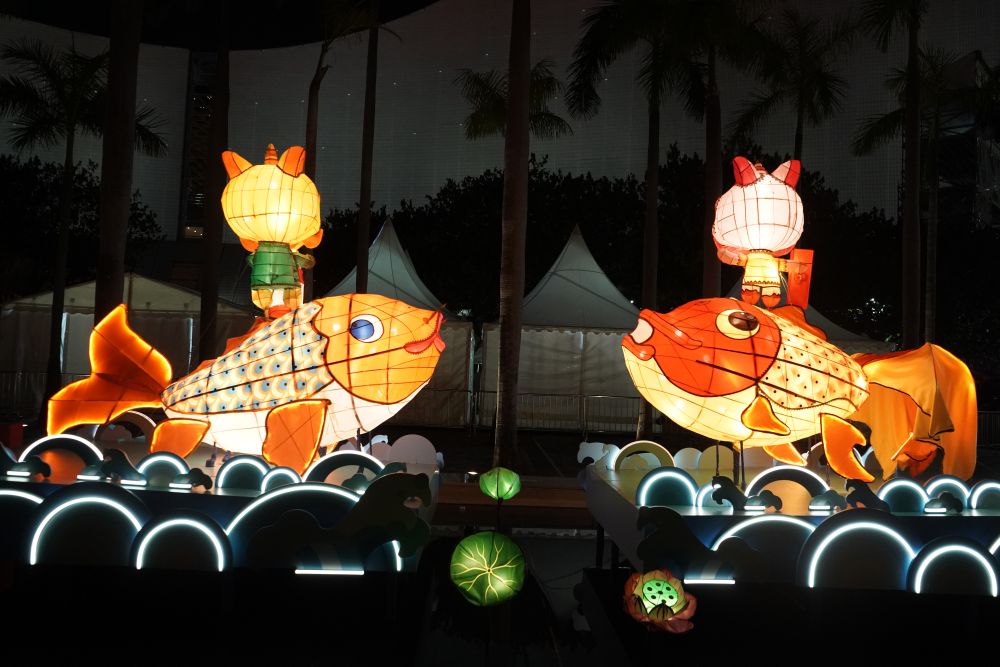 香港文化中心露天廣場上,一組由香港非物質文化遺產辦事處策劃的扎作彩燈與四周景色相映成趣,錦鯉與金魚在水池上躍動,小醒獅站在魚背上嬉戲。