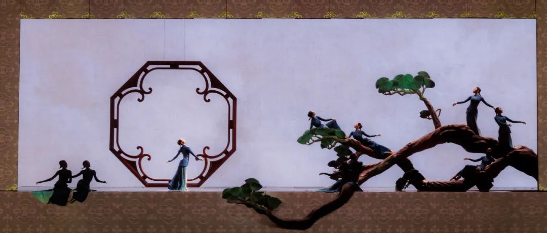 這是一幅工筆畫般的舞蹈,“細(xì)膩的平面美”貫穿始終。多處剪影的運用更是剝離了立體細(xì)節(jié),只留下氣韻流轉(zhuǎn)的線條,將所有的視覺重心都集中在平面構(gòu)圖之中。整個畫卷上,舞者化身成畫布上精心點綴的筆觸,風(fēng)枝搖綠影,鵲語落花間,每一個動作的鋪陳、每一次舞姿的凝固,都精致得令人屏息。