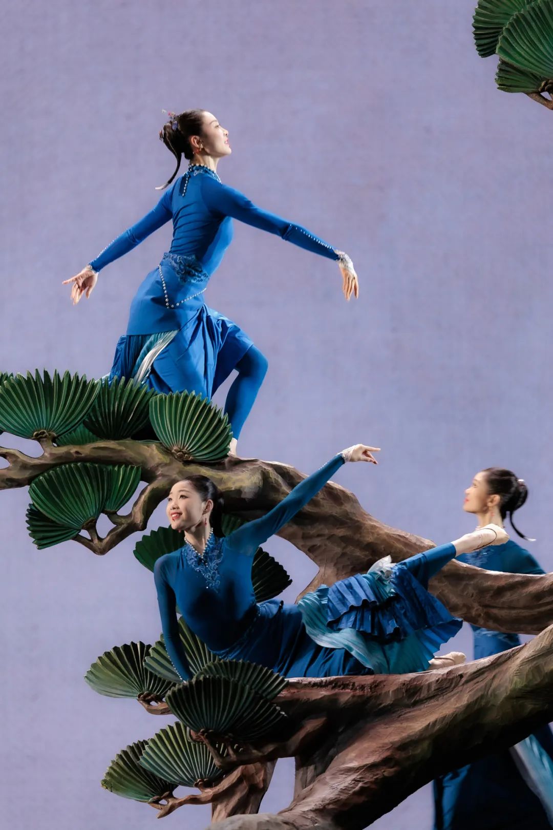 演員妝造也從傳統(tǒng)國畫中汲取靈感,選取了中國傳統(tǒng)色“花青”“靛藍(lán)”“月白”,與生活中黑白色調(diào)的喜鵲不同,取神似而非拘泥于寫實,更為舞臺增添一抹亮色和活潑??偱_臺長慎海雄在審看節(jié)目的時候,還特意將節(jié)目名稱從原來的《喜鵲登枝》改為《喜上枝頭》,弱化寫實,突出寫意,讓“送喜”的美好寓意更加鮮明。