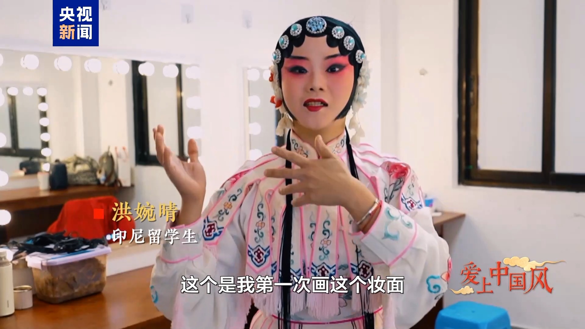 印尼留學生 洪婉晴:大家好,我是瑪麗莎。我的中文名叫洪婉晴,我來自印尼蘇門答臘島。今年是我到中國的第8個年頭了。喜歡川劇已經(jīng)有至少5年了吧,但像現(xiàn)在有化妝師給我做妝造,可以畫上旦角的妝面,穿上川劇戲服,來演一場戲真的是我人生中的第一次。