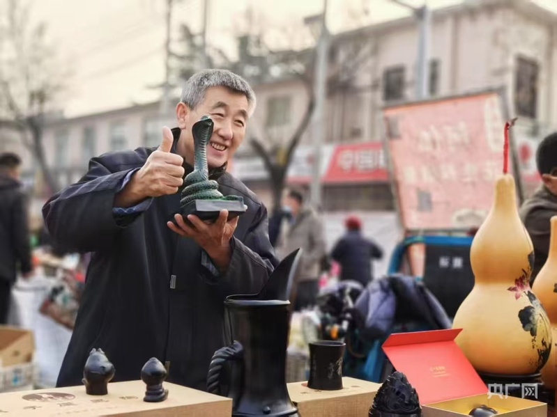 非遺項(xiàng)目章丘黑陶傳承人張國慶展示蛇年擺件(央廣網(wǎng)發(fā) 孟凡庚 攝)