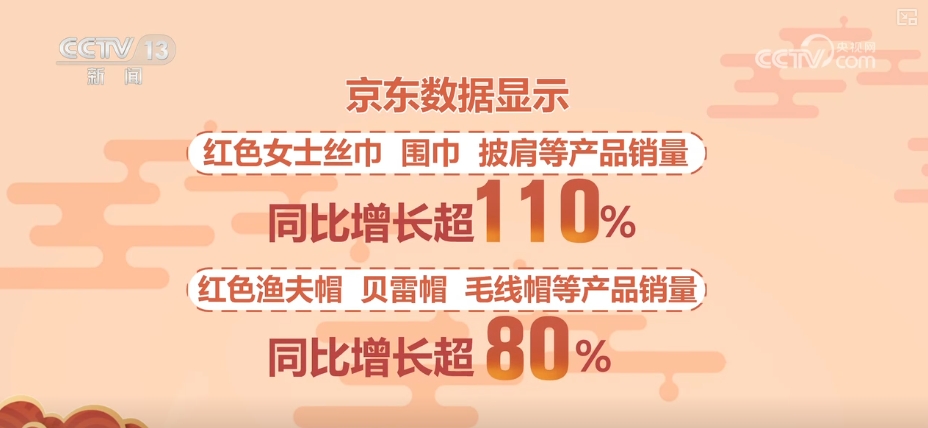 不僅是新年“戰(zhàn)袍”,新年配飾也要配齊。京東數(shù)據(jù)顯示,2025年,紅色的毛衣鏈銷量同比增長(zhǎng)超七倍,紅色手鏈、腳鏈、戒指銷量同比增長(zhǎng)超100%。也有很多用戶選擇用紅色帽子、圍巾來(lái)增添節(jié)日氛圍,紅色女士絲巾、圍巾、披肩等產(chǎn)品銷量同比增長(zhǎng)超110%,紅色漁夫帽、貝雷帽、毛線帽等產(chǎn)品銷量同比增長(zhǎng)也超過(guò)了80%。