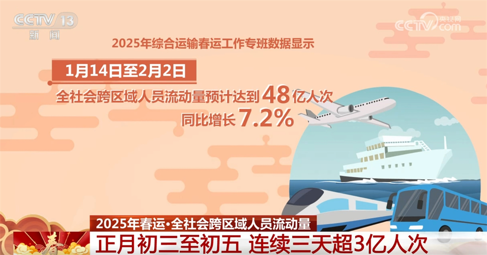 來自2025年綜合運(yùn)輸春運(yùn)工作專班數(shù)據(jù)顯示:1月14日至2月2日,全社會(huì)跨區(qū)域人員流動(dòng)量預(yù)計(jì)達(dá)到48億人次,同比增長7.2%;正月初三、初四、初五已連續(xù)三天超3億人次,均超去年同期水平。